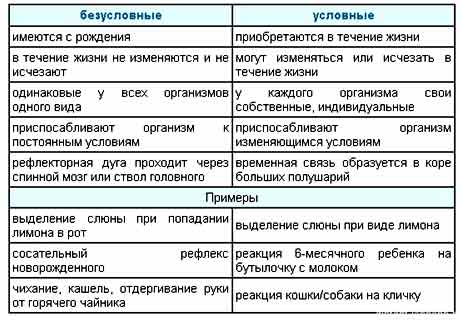 Перенесите таблицу по признакам условных и безусловных рефлексов в тетрадь.