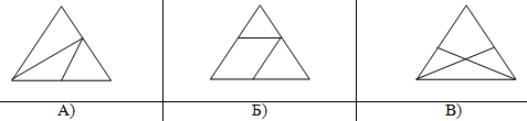в) треугольник делился на семь треугольников и один четырехугольник.