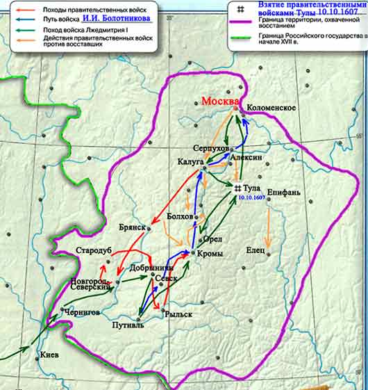 походы правительственных войск против Лжедмитрия I — обозначены красными стрелками