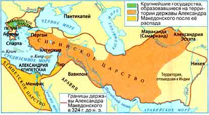 В соответствии с учебником истории тремя главными государствами, образовавшимися на месте державы Александра Македонского стали сама Македония, Сирийское царство и Египетское царство. Следует отметить, что изначально крупнейшими территориями распавшейся империи Александра управляли его полководцы и телохранители Селевк (территория Сирии), Птолемей (Египет), Антигон (Малая Азия, Финикия, Палестина, Греция), Лисимах (Фракия) и Кассандр (Македония). В результате решающей битвы у города Исп армия Антигона была разгромлена, а земли его государства были поделены.