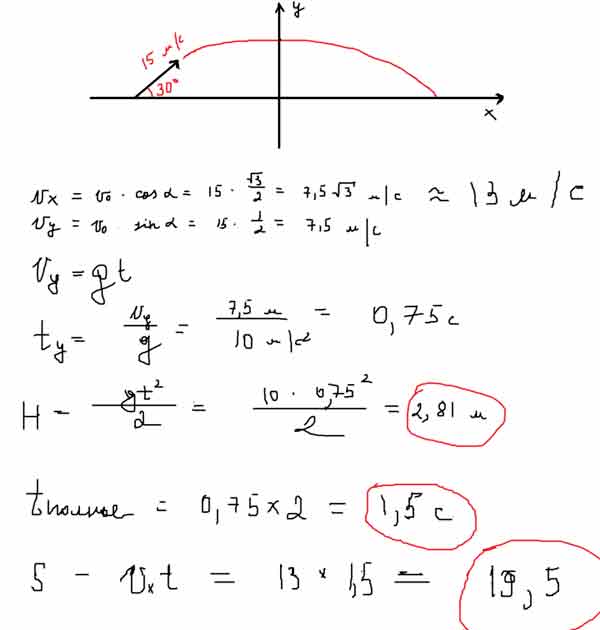 Тело брошено со скоростью 0 υ = 15 м/с под углом α = 30° к горизонту. Пренебрегая сопротивлением воздуха, определите: 1) высоту h подъема тела; 2) дальность полета (по горизонтали)  s тела; 3) время его движения.