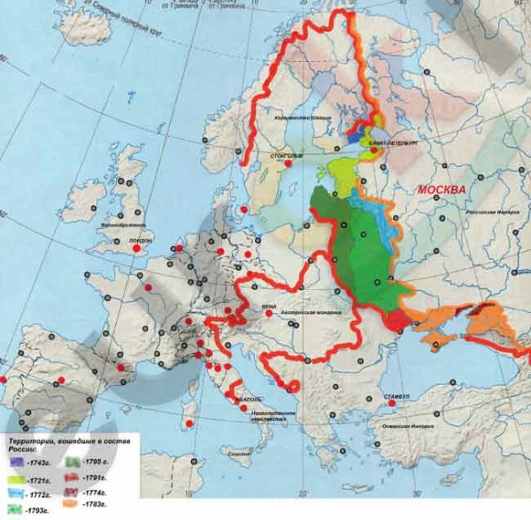 3.    В легенде подпишите годы вхождения в состав России территорий, обозначенных на карте цветом.