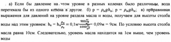 а)  Объясните, почему, когда жидкости находятся в равновесии, на уровне раздела масла и воды (он показан на рисунке пунктиром) давление р в обоих коленах одинаково.
