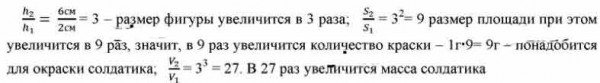 Для окраски маленького оловянного солдатика высотой 2 см и массой 10 г понадобится 1 г краски. Сколько краски понадобится для окраски солдатика такой же формы, но высотой 6 см? Слой краски имеет одинаковую толщину Какова масса большего солдатика?