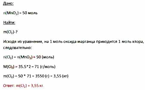 В борьбе с вредителями зерна плодов и овощей применяют хлор. Рассчитайте (в соответствии с уравнением реакции MnO2 + 4HCl = MnCl2 + Cl2 + 2H2O) массу хлора, необходимую для  обработки 100 м3 помещения. Хлор получают при расходе оксида марганца (4) количеством вещества 50 моль