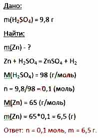 Вычислите количество вещества и массу цинка, который прореагирует с 9,8 г серной кислоты H2SO4