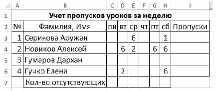 Дана таблица учета пропусков учащихся. Напишите функцию для вычисления количества дней, когда Алексей пропустил уроки