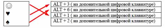 Смайлик Alt+1, сердечко Alt+3, пика Alt+6