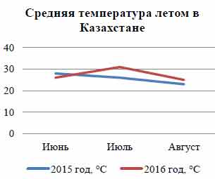 Дана таблица, отражающая показатели среднемесячной температуры за лето 2015 и 2016 гг. в Казахстане