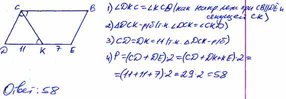 В параллелограмме BCDE биссектриса угла С пересекает сторону DE в точке К, причем ЕК = 7, DK =11. Найдите периметр параллелограмма.