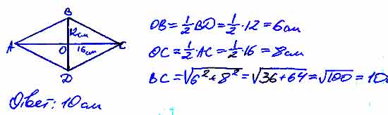 Найдите сторону ромба, если его диагонали равны 12 см и 16 см.