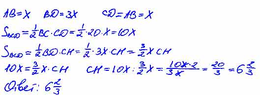 На рисунке ABCD — прямоугольник, CH _I_ BD, сторона АВ в 3 раза меньше диагонали. Найдите СН, если ВС = 20.