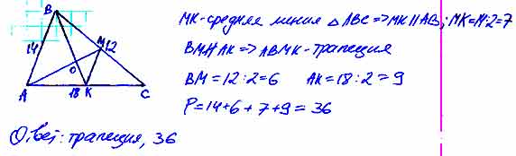 AM и ВR — медианы треугольника ABC, Определите вид четырехугольника АВМК и найдите его периметр, если АВ = 14, ВС = 12, АС =18.