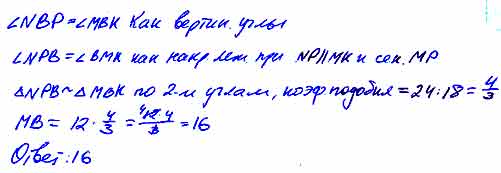 Найдите длину отрезка MB, если в изображенной на рисунке трапеции MNPK известно: МК = 24, NР = 18, ВР = 12.