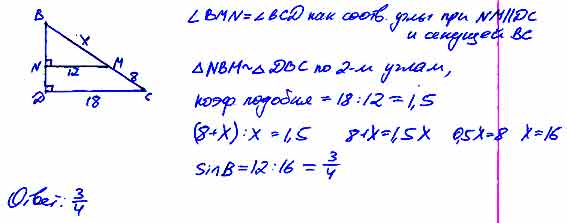 В прямоугольном треугольнике BCD из точки М, лежащей на гипотенузе ВС, опущен перпендикуляр MN на катет BD. Найдите синус угла В, если MN = 12, CD = 18, МС = 8.