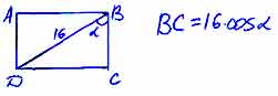 Диагональ прямоугольника ABCD равна 16, угол CBD равен а. Найдите сторону ВС.