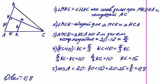 В треугольнике ABC прямая, параллельная стороне АВ, пересекает высоту СН в точке М и сторону АС в точке К. Найдите косинус угла А, если МК = 12, АН = 20,