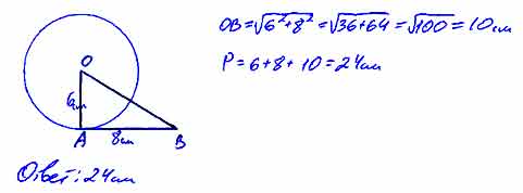 Найдите периметр треугольника АОВ, если прямая АВ касается в точке А окружности с центром О и радиусом 6 см, а длина отрезка АВ равна 8 см.