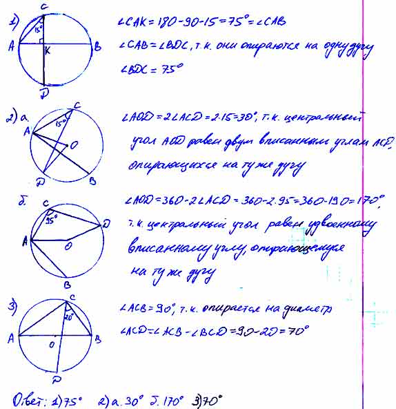 3)  Найдите  ACD, если хорда АВ проходит через центр О,  ∠BCD = 20°.