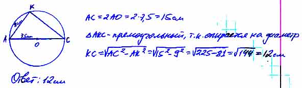 В окружности с радиусом 7,5 см проведены диаметр АС и хорда АК  равная 9 см.