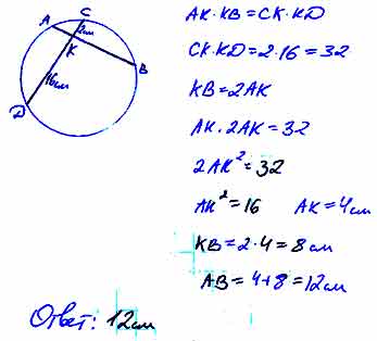 Две хорды одной окружности пересекаются в точке, делящей одну хорду на отрезки 2 см и 16 см, а другую — на отрезки, один из которых в 2 раза больше другого. Найдите длину второй хорды.