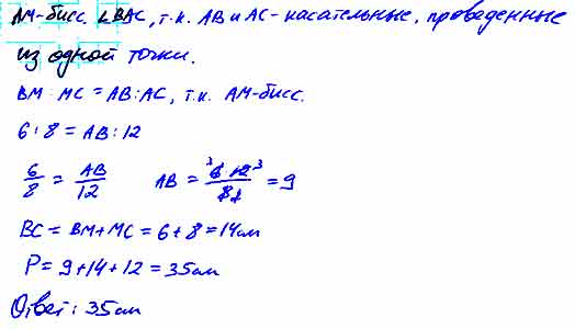 Найдите периметр треугольника ABC, изображенного на рисунке, если точка О — центр вписанной окружности, ВМ = 6 см, МС = 8 см, АС = 12 см.