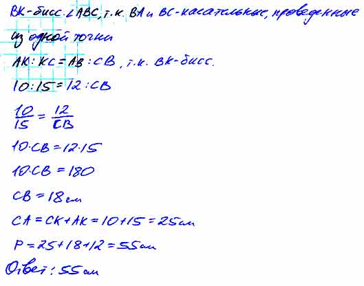 Найдите периметр треугольника ABC, изображенного на рисунке, если точка О — центр вписанной окружности, АК = 10 см, СК = 15 см, АВ = 12 см.