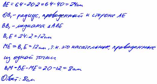 Треугольник ABE — равнобедренный с основанием АЕ. Его периметр равен 64 см, BE = 20 см. Найдите длину отрезка ВМ (М — точка касания вписанной окружности со стороной BE).