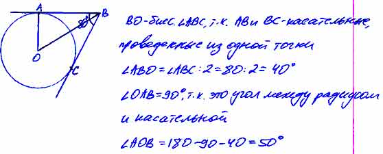К окружности с центром О проведены касательные ВА и ВС (А и С — точки касания). Найдите ∠AOB, если  ∠ABC = 80°.