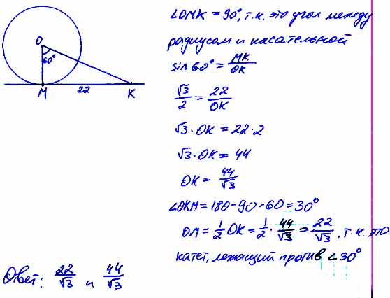 Прямая МК касается в точке М окружности с центром О, причем, МК = 22. Найдите радиус окружности и длину отрезка ОК, если ∠MOK = 60°