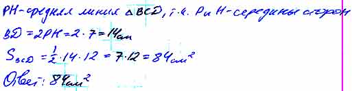 На рисунке точки P и Н — середины сторон, СК — высота треугольника. Найдите площадь треугольника, если РН = 7 см, С К = 12 см.