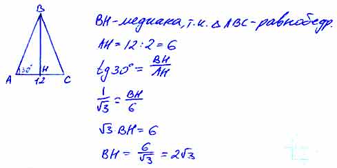 Найдите высоту, проведенную к основанию равнобедренного треугольника, если основание равно 12, а угол при основании равен 30°.