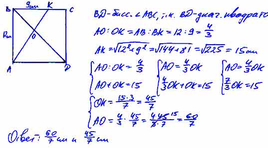 В квадрате ABCD диагональ BD пересекает отрезок АК (К е ВС) в точке О. Найдите длины отрезков АО и ОК, если сторона квадрата равна 12 см, а отрезок ВК равен 9 см.