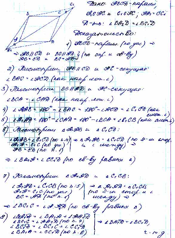 Дан параллелограмм ABCD. На продолжении диагонали АС за вершины А и С отмечены точки А1 и С1 соответственно так, что АА1 = СС1. Докажите, что ∠BA1D = ∠BC1D.