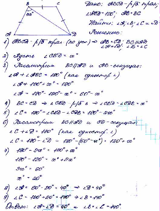 В равнобедренной трапеции диагональ составляет с боковой стороной угол в 120°. Боковая сторона равна меньшему основанию. Найдите углы трапеции.