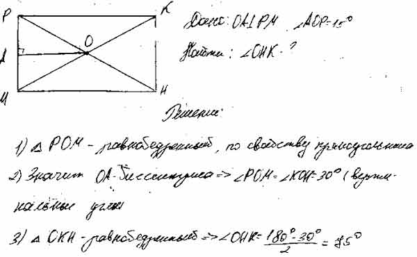 В прямоугольнике МРКН диагонали пересекаются в точке О. Отрезок ОА является высотой треугольника MOP, ∠AOP = 15°. Найдите ∠OHK.