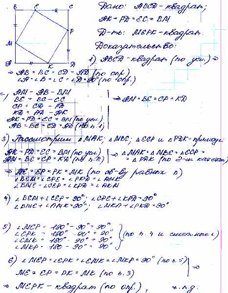 На рисунке 1 четырехугольник ABCD — квадрат, АК = PD = ЕС = ВМ. Докажите, что выпуклый четырехугольник МЕРК также является квадратом.