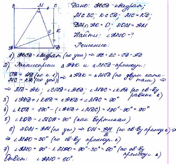 На сторонах ВС и CD квадрата ABCD отмечены точки М и К соответственно, МС = KD. Отрезки DM и АК пересекаются в точке О, 2ОМ = AM. Найдите угол AMО.