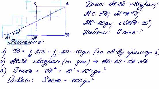 На продолжении стороны AD квадрата ABCD за вершину А взята точка М, МС = 20 дм, ∠CMD = 30°. Найдите площадь квадрата.