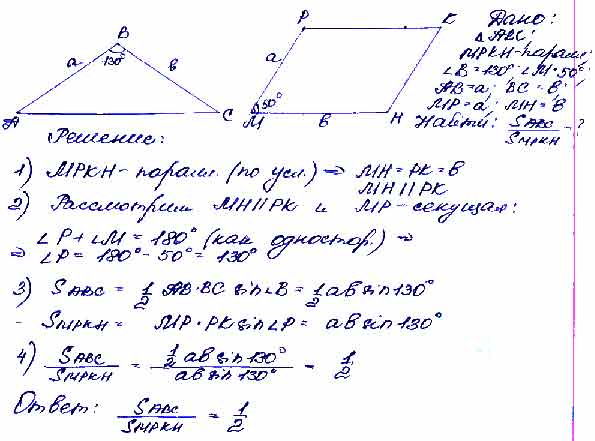 В треугольнике ABC ∠B = 130°, АВ = а, ВС = b, а в параллелограмме МРКН MP = а, МН = b, ∠M = 50°. Найдите отношение площади треугольника к площади параллелограмма