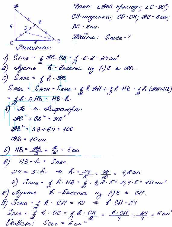 В прямоугольном треугольнике ABC точка О — середина медианы СН, проведенной к гипотенузе АВ, АС = 6 см, ВС = 8 см. Найдите площадь треугольника ОВС