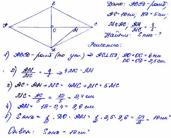 В ромбе ABCD диагонали равны 5 см и 12 см. На диагонали АС взята точка М так, что AM : МС = 4:1. Найдите площадь треугольника AMD