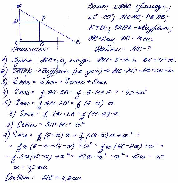 В треугольнике ABC ∠C = 90°. На сторонах АС, АВ, ВС соответственно взяты точки М, Р, К так, что четырехугольник СМРК является квадратом, АС = 6 см, ВС = 14 см. Найдите сторону МС