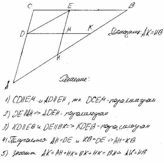 На сторонах АС и ВС треугольника ABC отмечены точки D и Е соответственно, а внутри треугольника — точка М так, что четырехугольник DC ЕМ является параллелограммом и DE || АВ. Прямая DM пересекает отрезок АВ в точке К, а прямая ЕМ — в точке Н. Докажите, что АК = НВ
