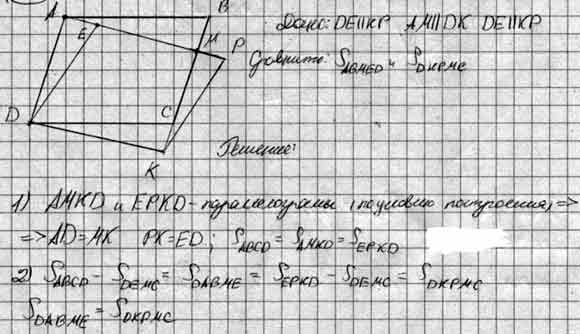 В параллелограмме АВСD угол А тупой. На стороне ВС взята точка М, а через вершину D проведена прямая, параллельная АМ и пересекающая луч МС в точке К. Точка Е принадлежит отрезку АМ. На прямой ЕМ отмечена точка Р так, что DE ǁ KP. Сравните площади невыпуклых пятиугольников АВМЕD и DКРМС.