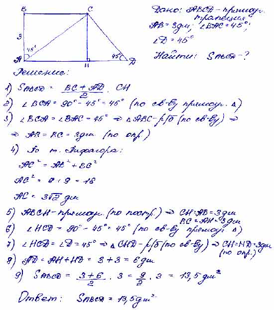 В прямоугольной трапеции меньшая боковая сторона равна 3 дм и составляет с меньшей диагональю угол в 45°. Острый угол трапеции также равен 45°. Найдите площадь трапеции.