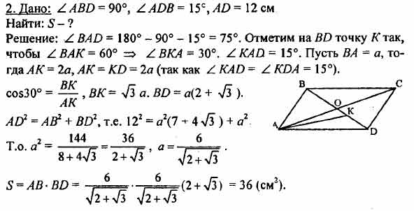 Диагональ параллелограмма составляет со сторонами углы в 90° ив 15°. Найдите площадь параллелограмма, если его большая сторона равна 12 см.