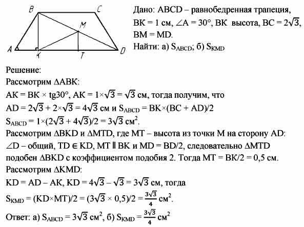 В равнобедренной трапеции ABCD AD || ВС, ∠A = 30°, высота В К равна 1 см, ВС = 2√3см. а)    Найдите площадь трапеции. б)    Найдите площадь треугольника KMD, если М — середина отрезка BD.