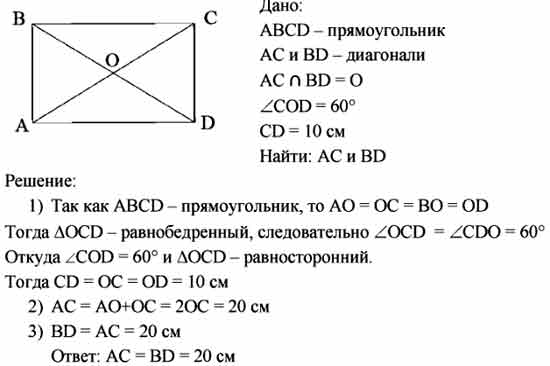 В прямоугольнике ABCD диагонали пересекаются в точке О; ∠COD = 60°, CD = 10 см. Чему равны диагонали прямоугольника?