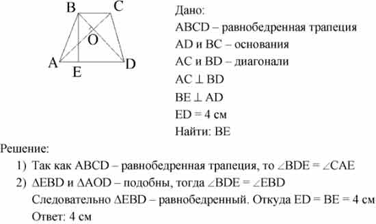 В равнобедренной трапеции ABCD (AD и ВС — основания) диагонали взаимно перпендикулярны. BE 1 AD; ED = 4 см. Чему равна высота трапеции?